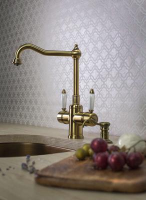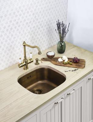 Прекрасно сочетается с мойками из композитного материала, акрилового или натурального камня, нержавеющей стали или керамики